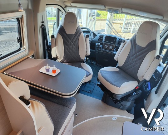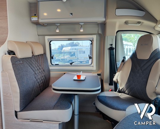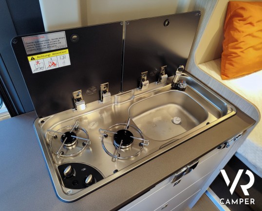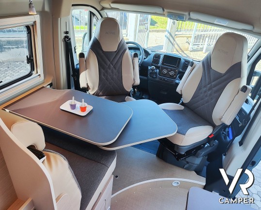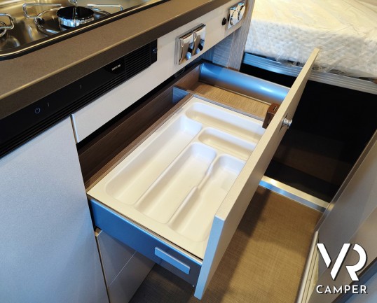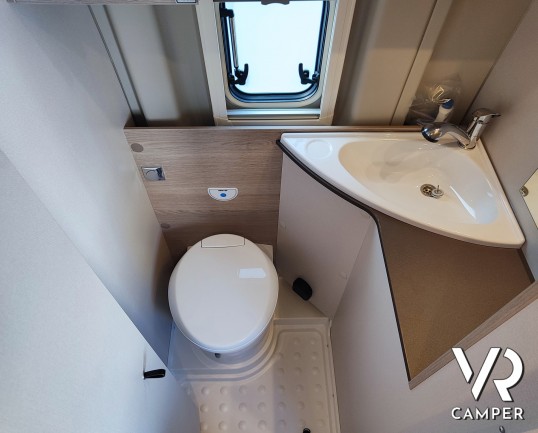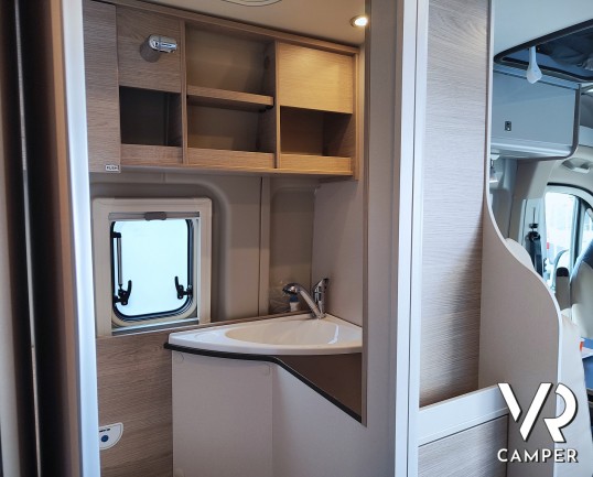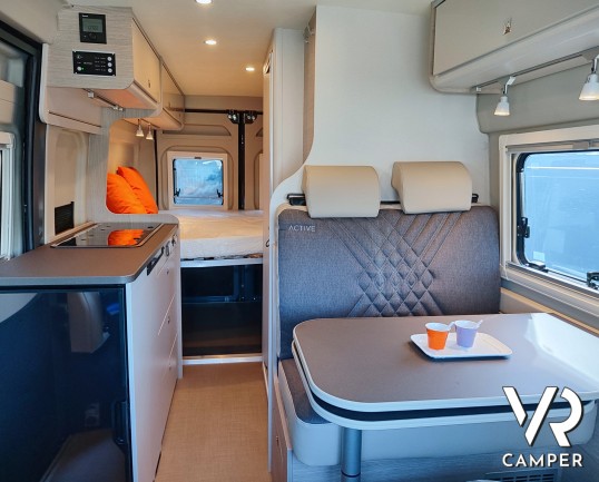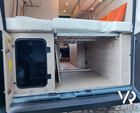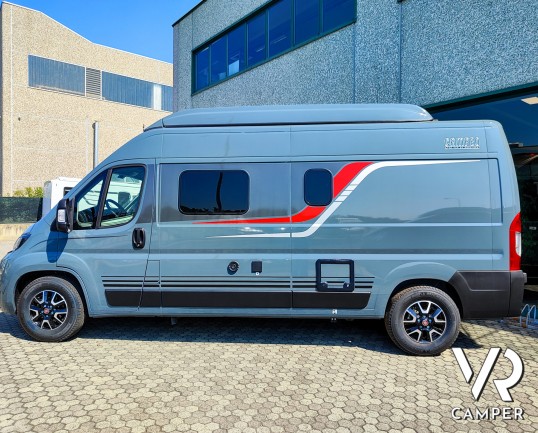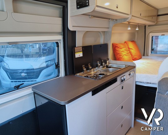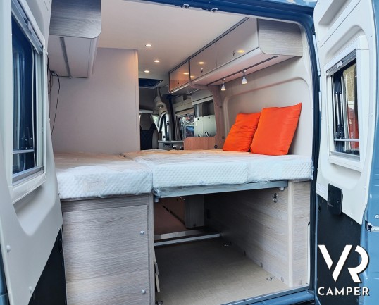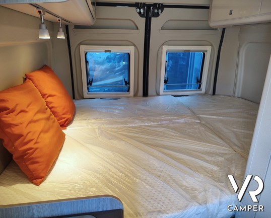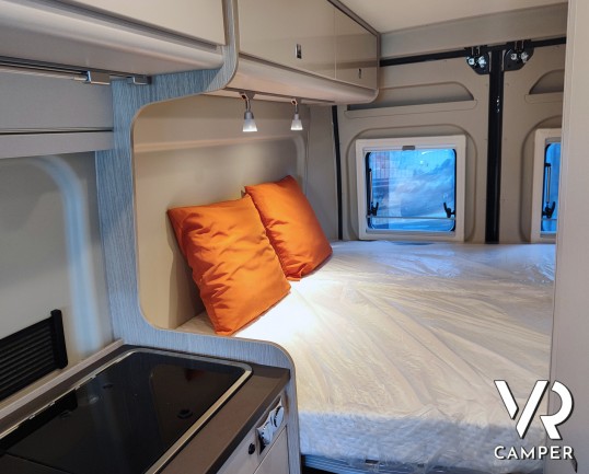 Camper furgonato nuovo 4 posti, con letto matrimoniale posteriore, dotato di cucina e toilette. Da VR Camper a Torino - Druento.