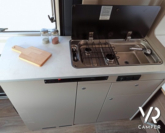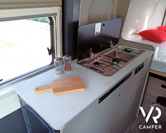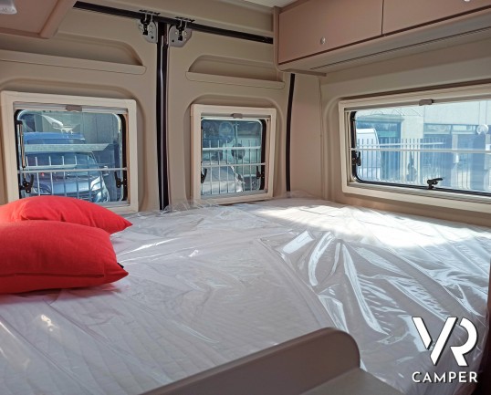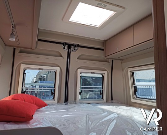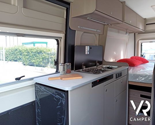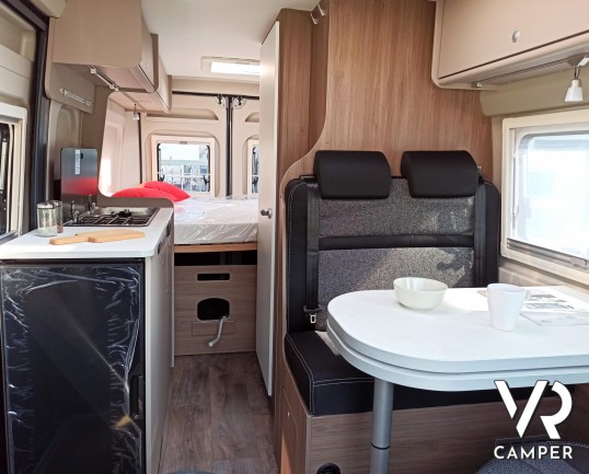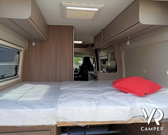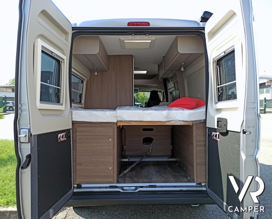 Camper furgonato nuovo con letto matrimoniale. Pratico per la vita quotidiana grazie alle misure compatte, ma sempre equipaggiato con tutto per le vacanze.