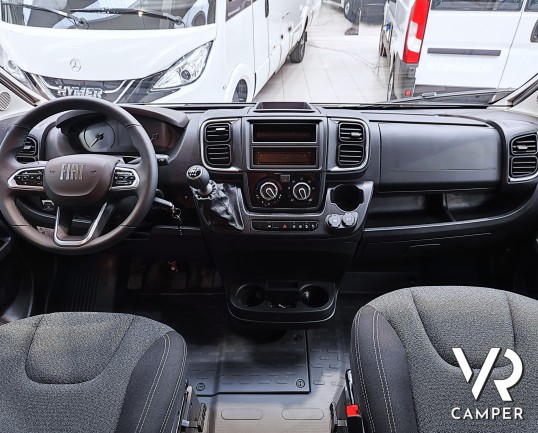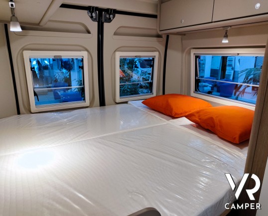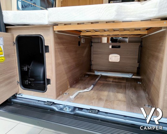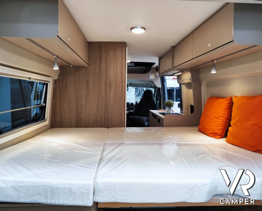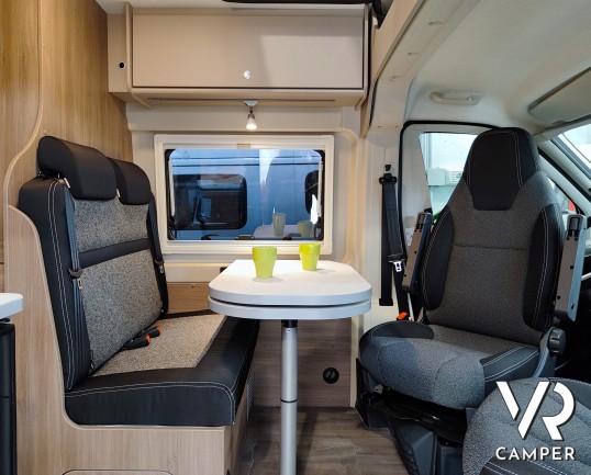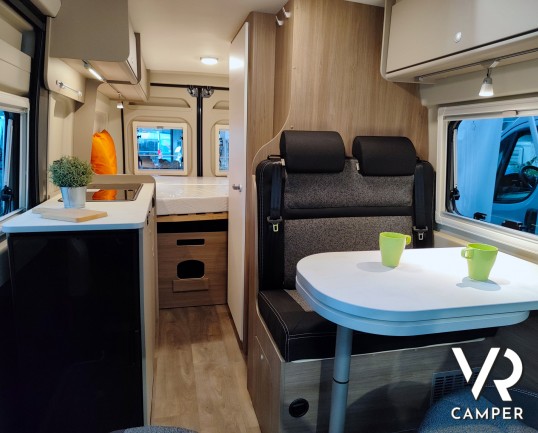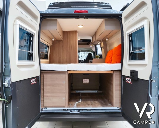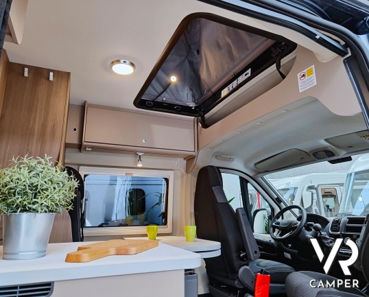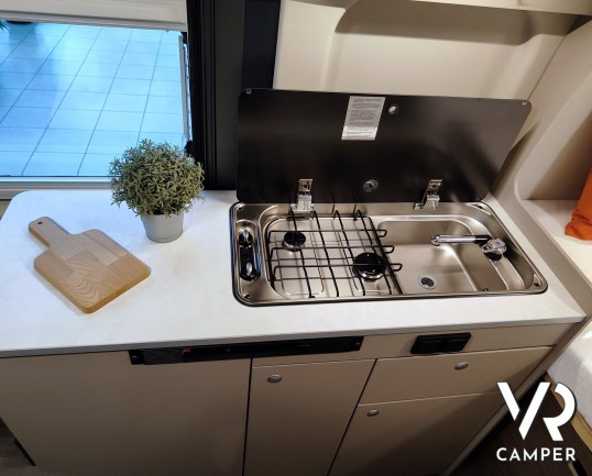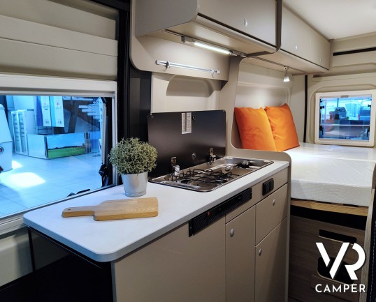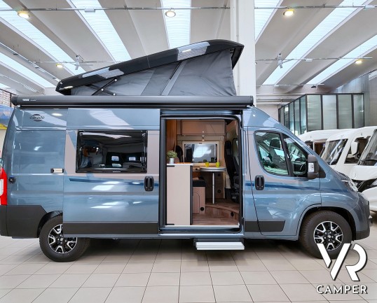 Camper furgonato nuovo con tetto sollevabile. Pratico per la vita quotidiana grazie alle misure compatte, ma sempre equipaggiato con tutto per le vacanze.