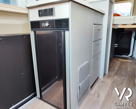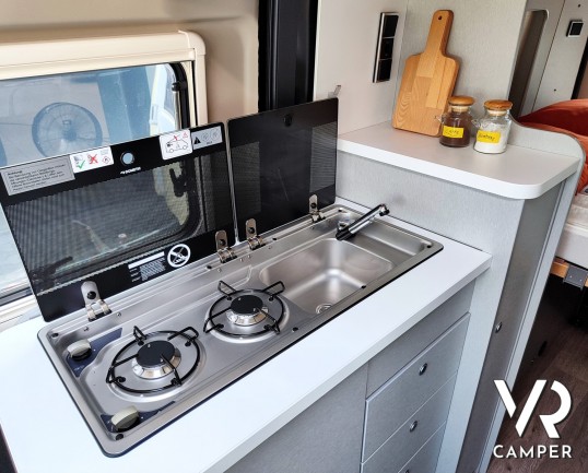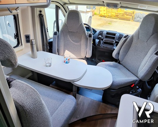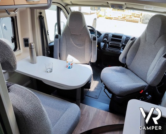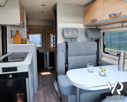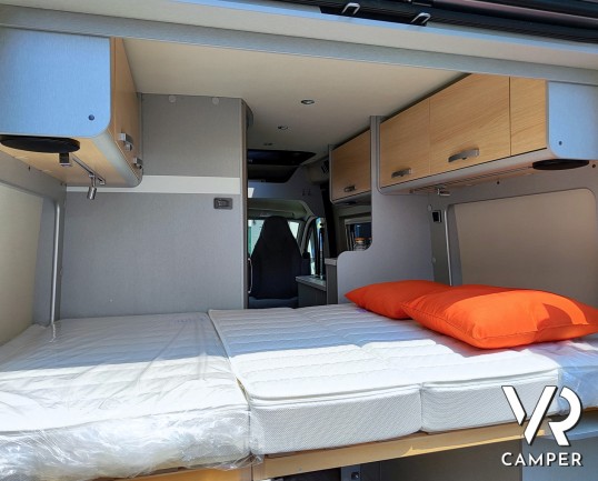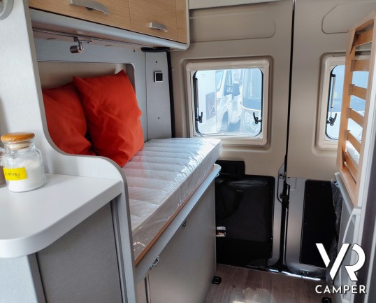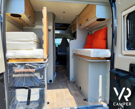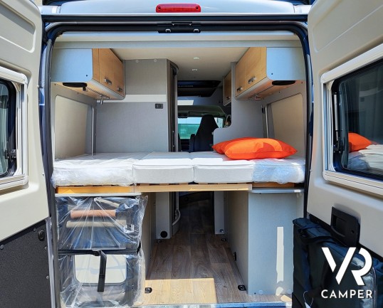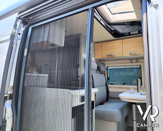 Camper furgonato nuovo colore grigio Artense, con tetto sollevabile e 4 posti letto, dotato di veranda e pacchetto "Ready to camp". Su Fiat Ducato 140 CV.