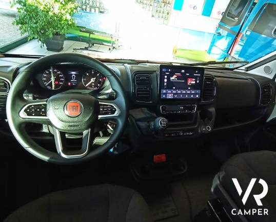 "La dotazione di base è già discreta e prevede finestrini elettrici, sedili cabina girevoli in tessuto come la dinette, doppio airbag, cruise control, ESC traction e Hill Holder, chiusura centralizzata."