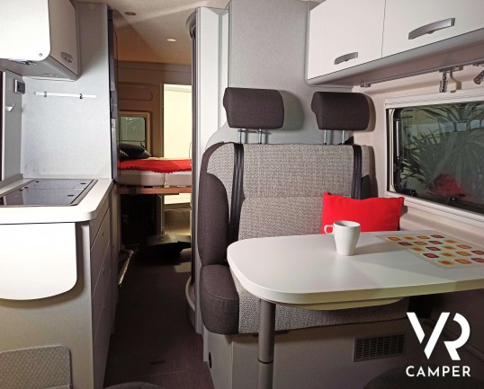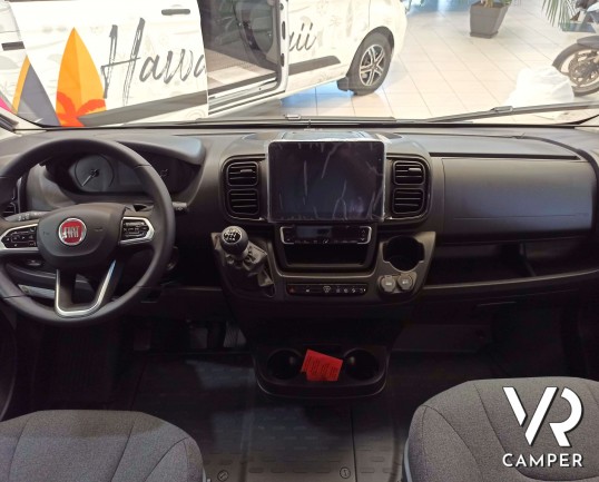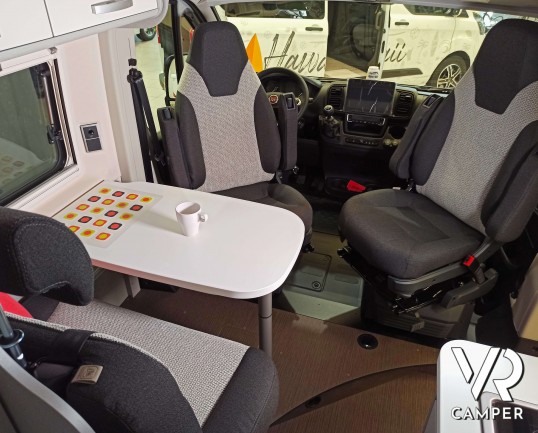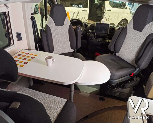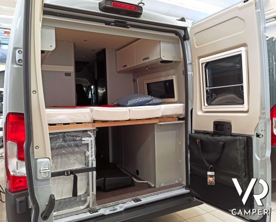 Camper furgonato nuovo con tetto sollevabile, 4 posti letto, dotato di freno elettrico, riscaldamento aria calda, sedie e tavolo pieghevoli. Su Fiat Ducato