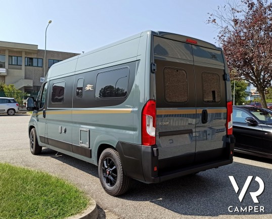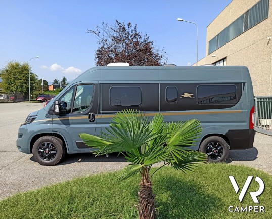Camper furgonato con 2 posti letto. Colore grigio Lanzarote, accessoriato con pacchetto Chassis, pacchetto Comfort, cerchi in lega. Da VR Camper a Torino.