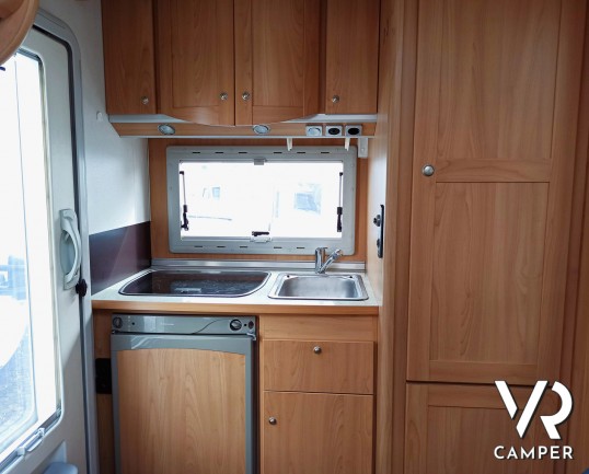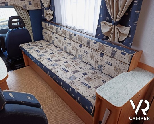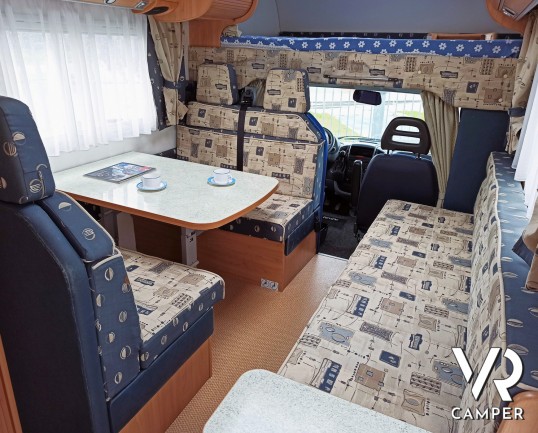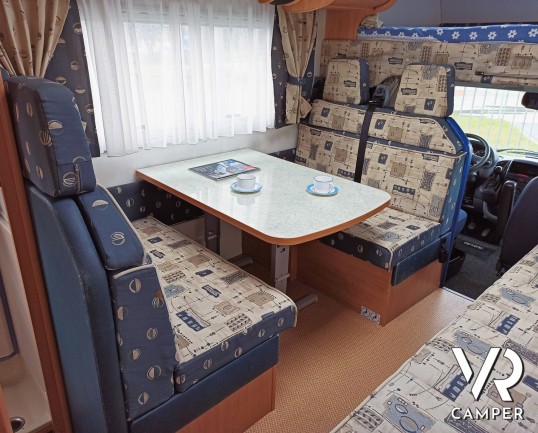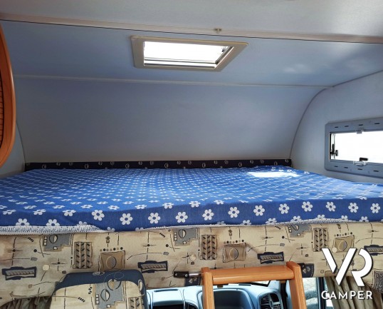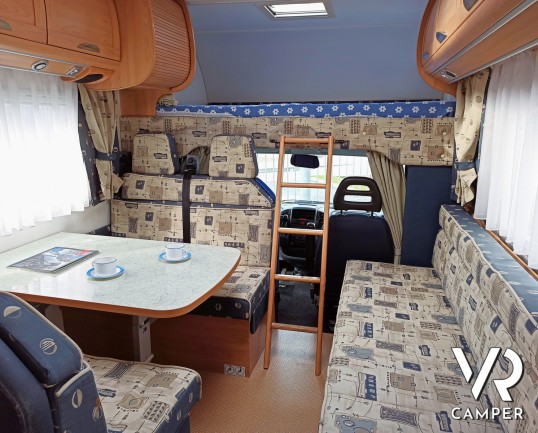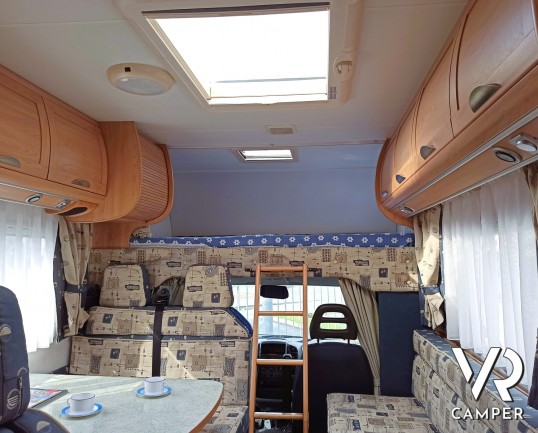 Camper mansardato usato con 5 posti letto e 5 posti omologati, Dotato di tendalino, portabici, retrocamera. Solo 5,63 m di lunghezza. Su Fiat Ducato 127 CV