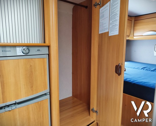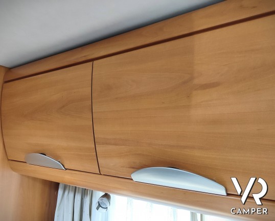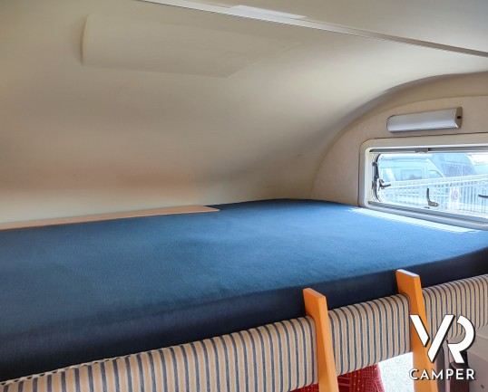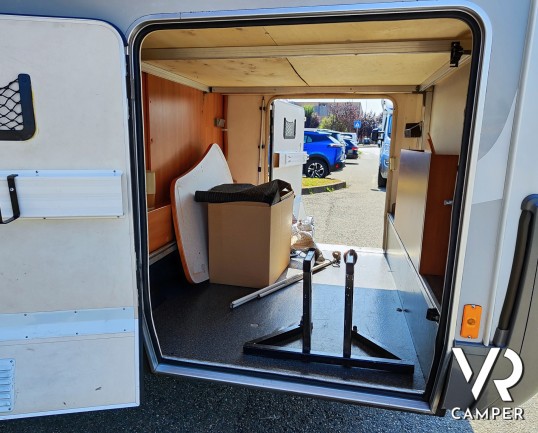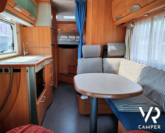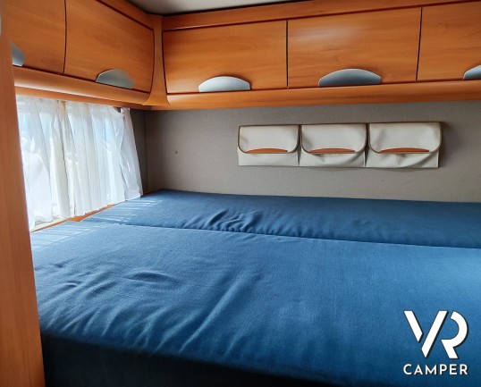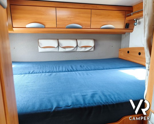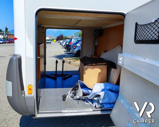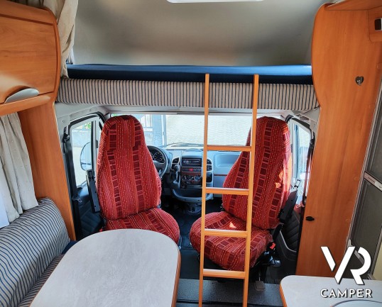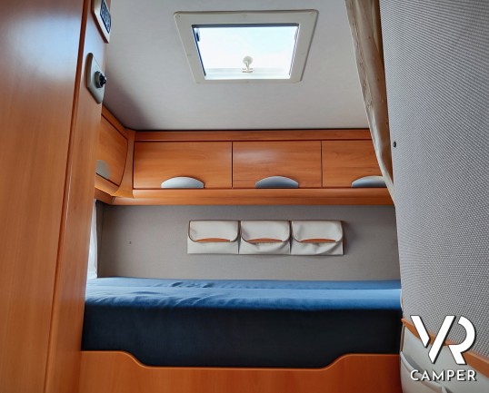 Camper mansardato usato con letto matrimoniale trasversale in coda, letto mansardato e grande garage con doppio portellone. In vendita a VR Camper a Torino