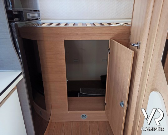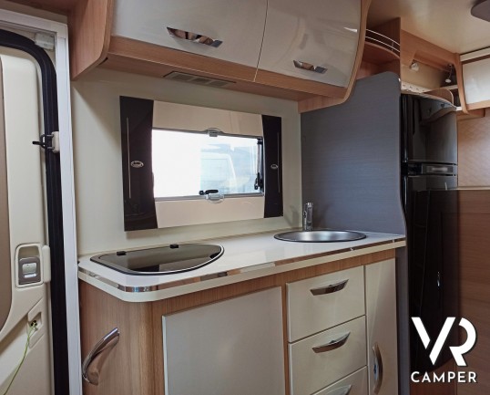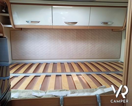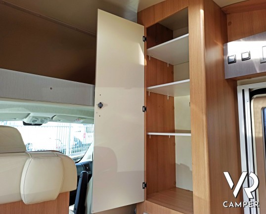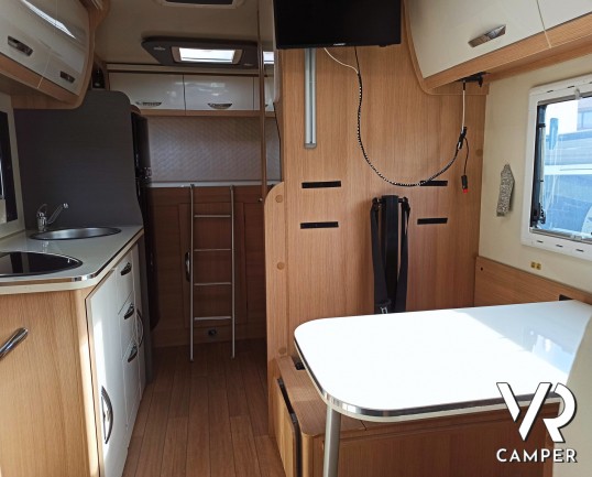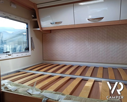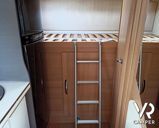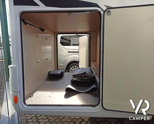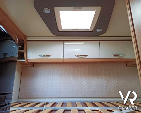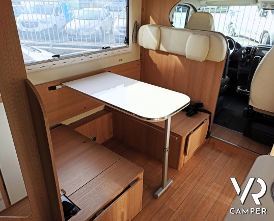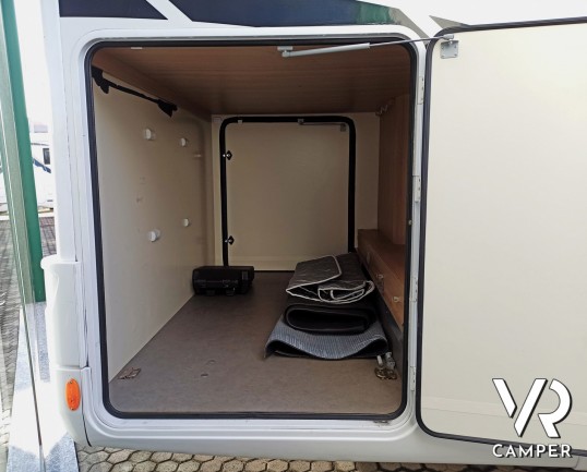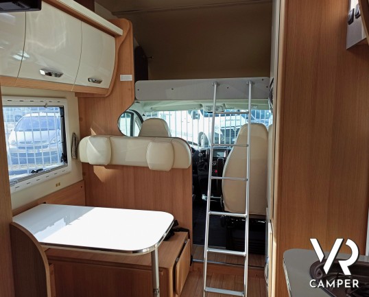 Camper usato mansardato con letto matrimoniale trasversale in coda, letto in mansarda e dinette matrimoniale. Dotato di garage. Su Fiat Ducato 130 CV.