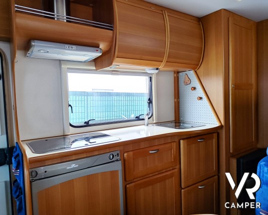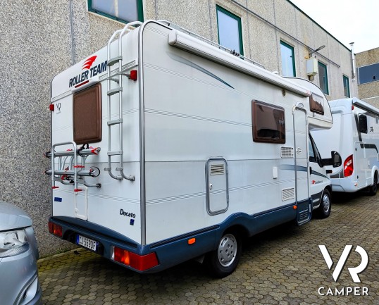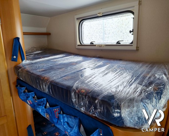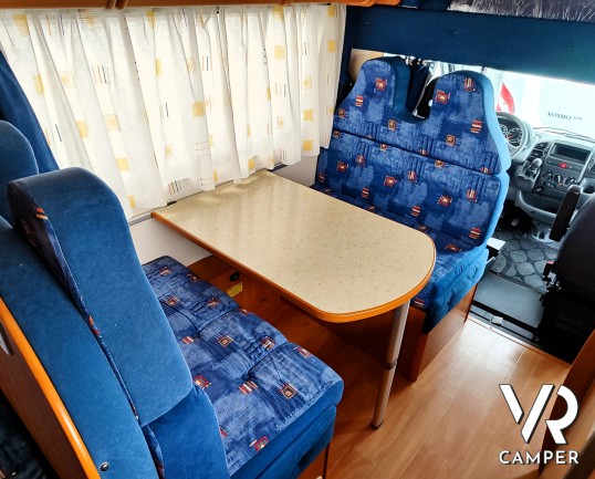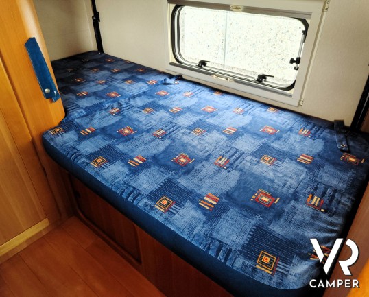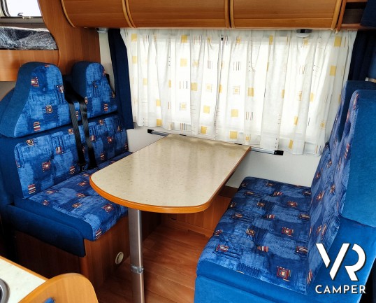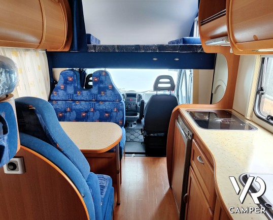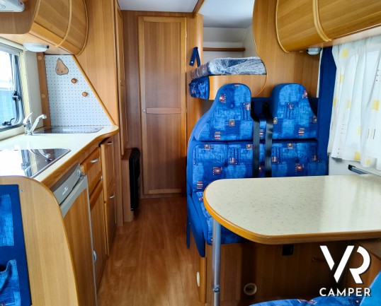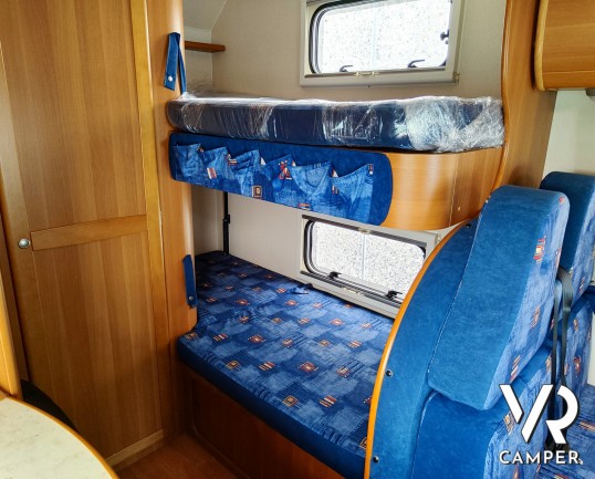 Camper mansardato usato con 6 posti letto: letto a castello laterale, dinette trasformabile e letto in mansarda. Su Fiat Ducato 2,8 jtd 127 CV.