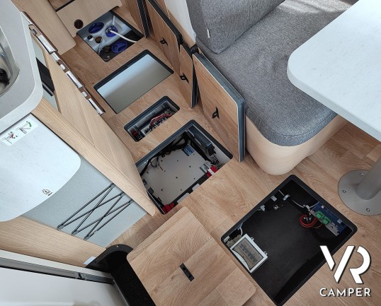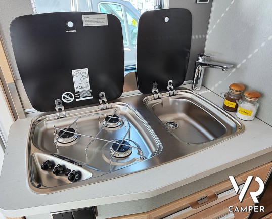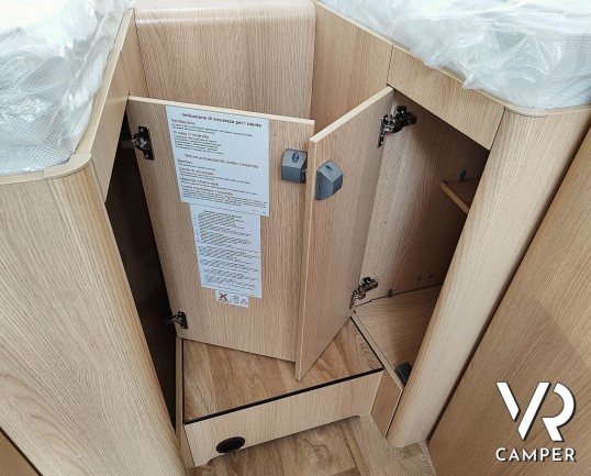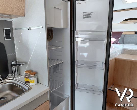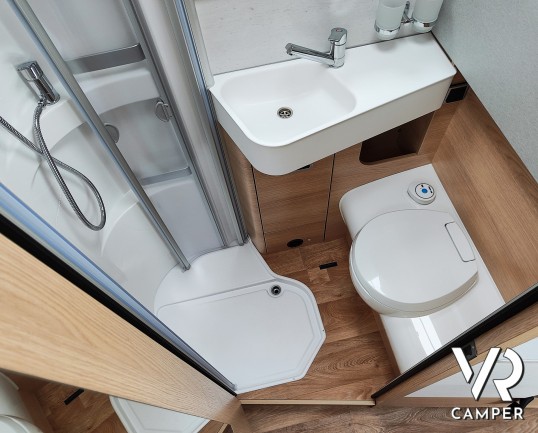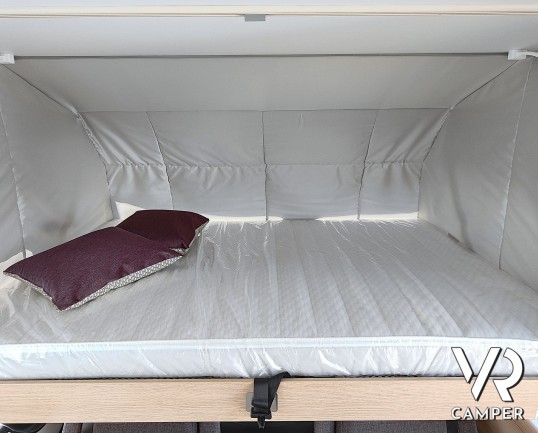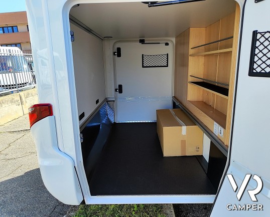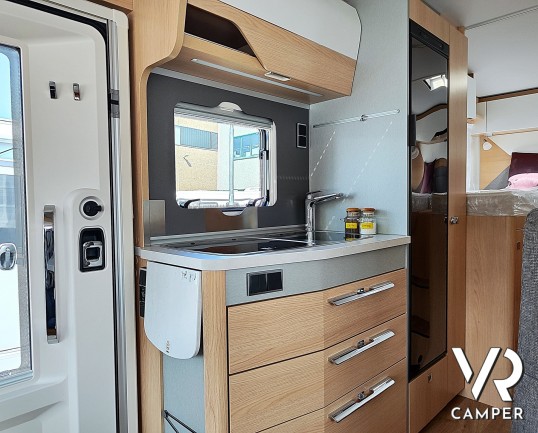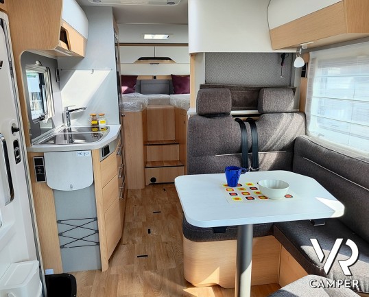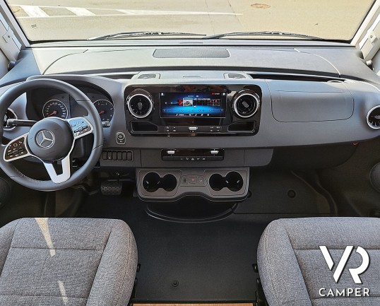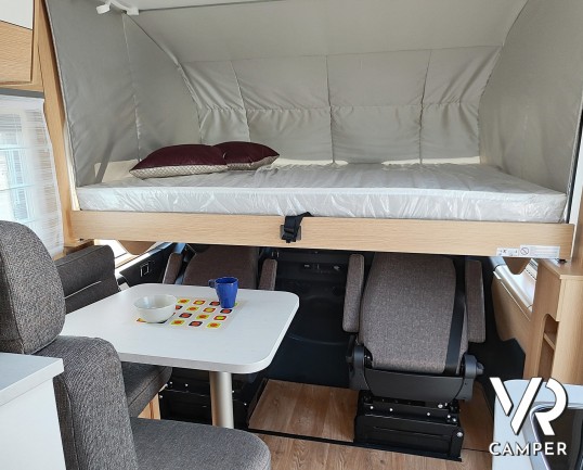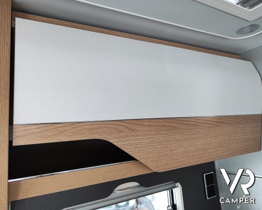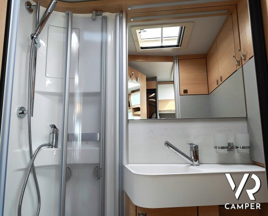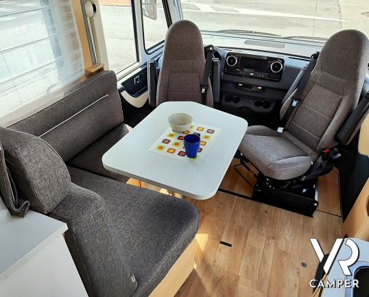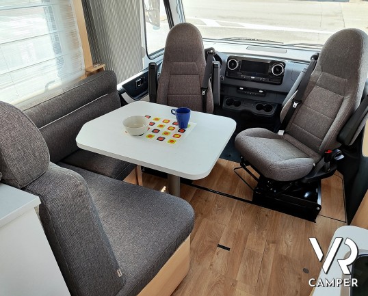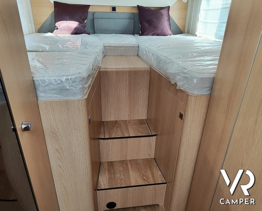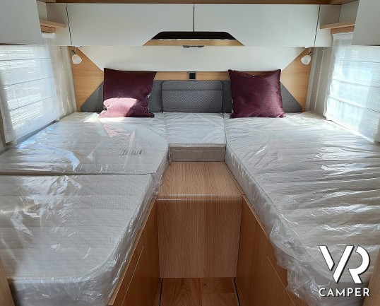 Camper nuovo motorhome con letti gemelli e basculante, 4 posti letto. Dotato di bagno con doccia separabile, cucina in linea e garage. Su Mercedes-Benz.