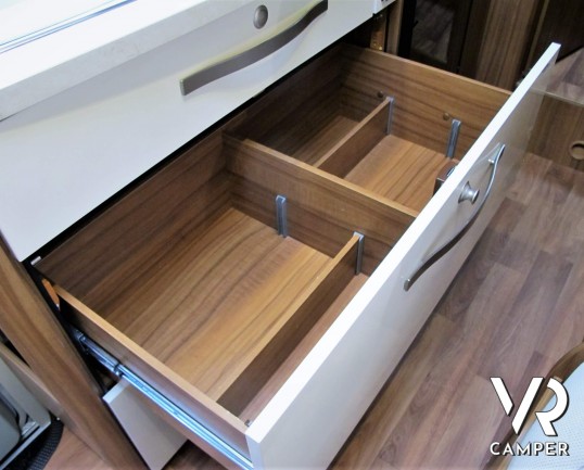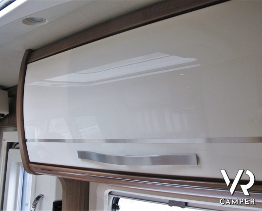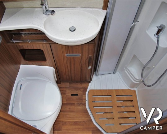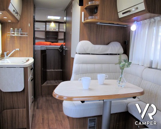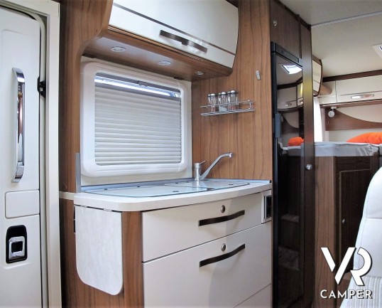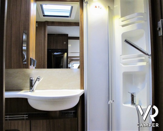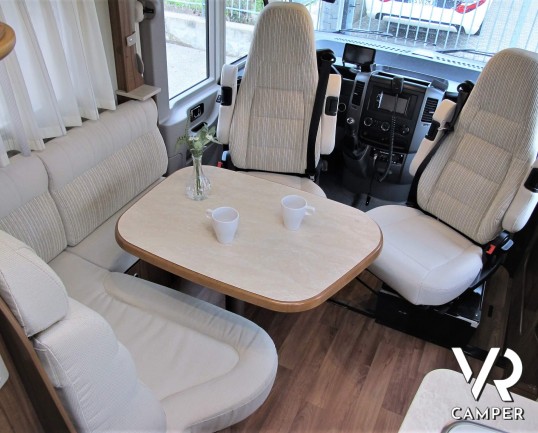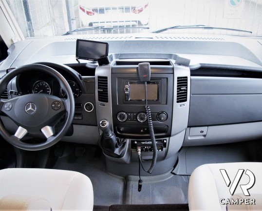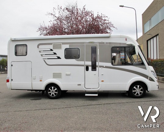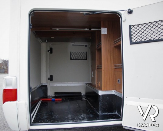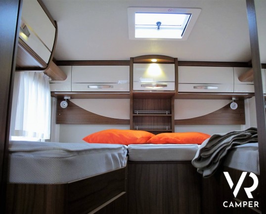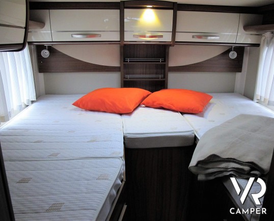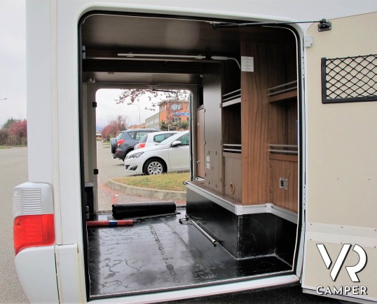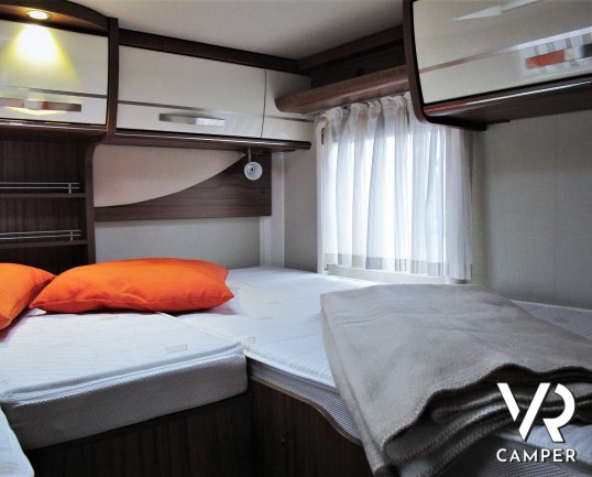 Spazioso camper motorhome usato con letti gemelli, bagno con doccia separata, cucina longitudinale e garage con doppio portello. Su Mercedes 163 CV.
