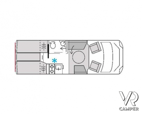 Divano lato guida convertibile in una seduta a L (in totale 4 sedili a cintura), incl. tavolo pieghevole e scorrevole con sistema di guide a pavimento