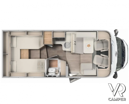 Nuovo design per il semintegrale Carado con letti gemelli e basculante, 5 posti omologati, ampi spazi interni in meno di 7 metri di lunghezza. Da VR Camper