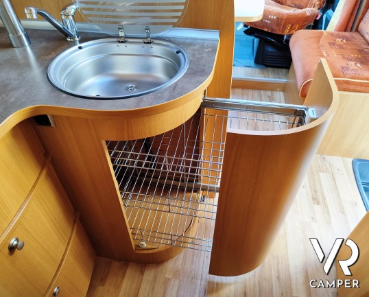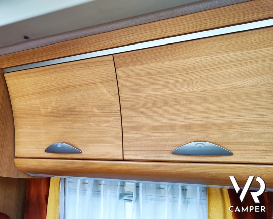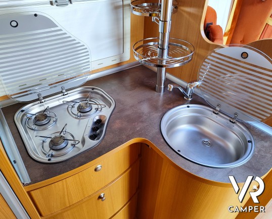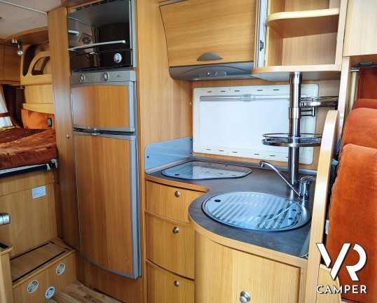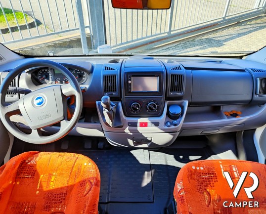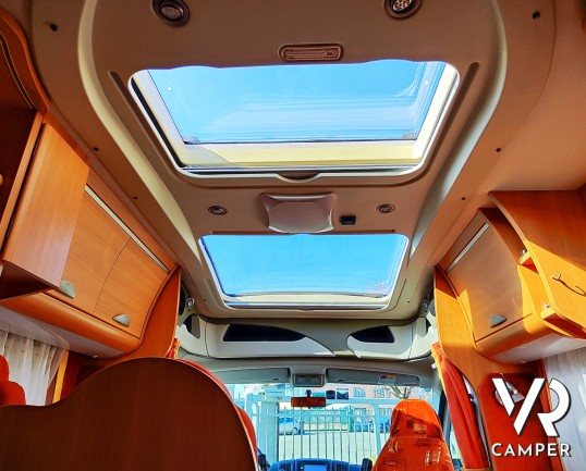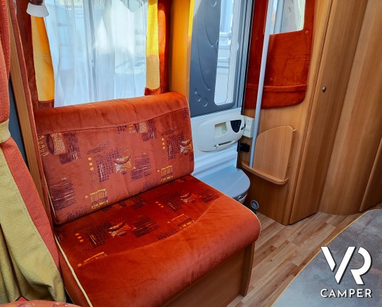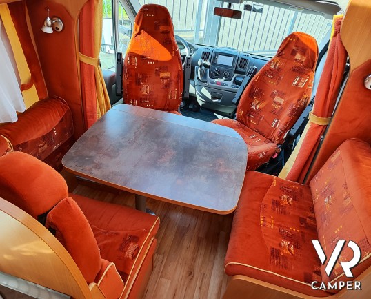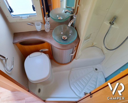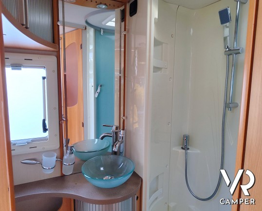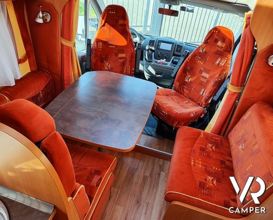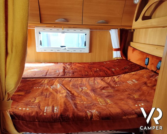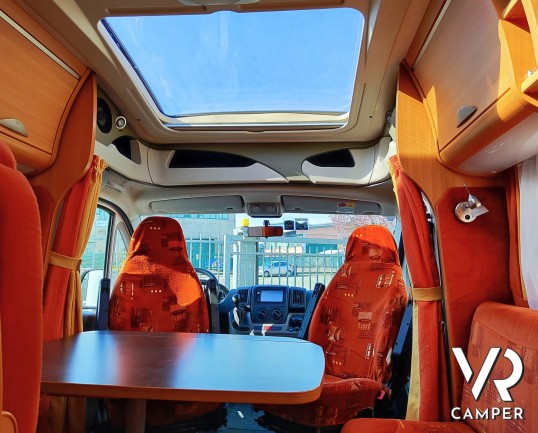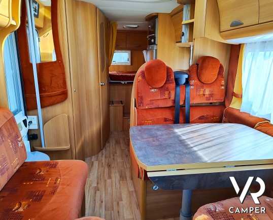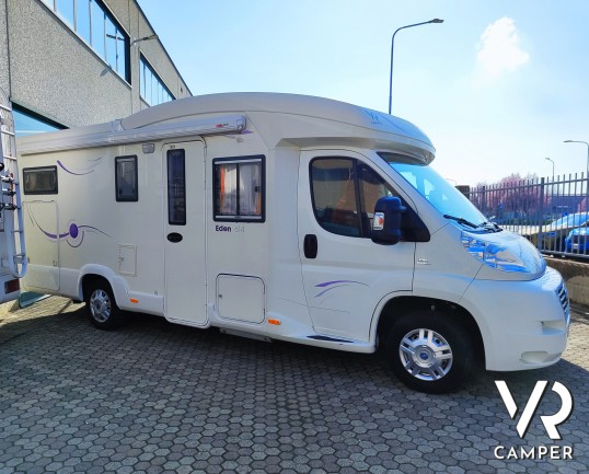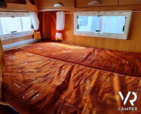 Camper semintegrale con letto matrimoniale trasversale posteriore e dinette convertibile in letto supplementare. Bagno con doccia separata, garage.
