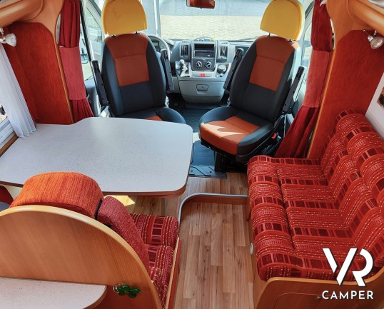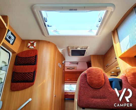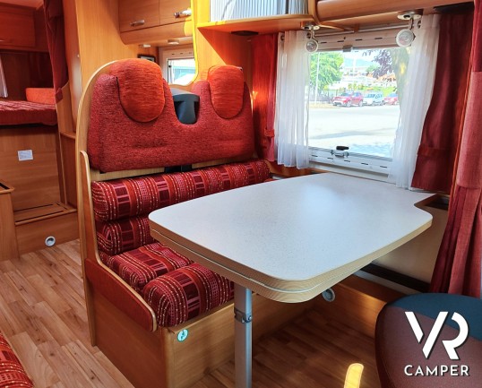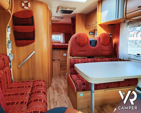 Piantina con ampia dinette con divano laterale e sedili girevoli, bagno con doccia e letto matrimoniale trasversale in coda. Lunghezza inferiore ai 7 metri
