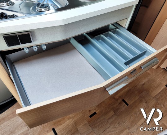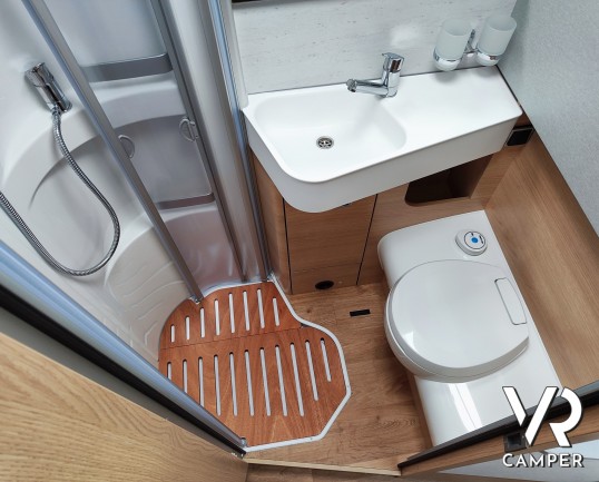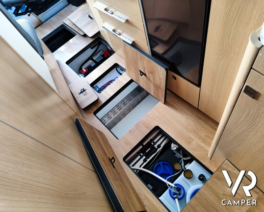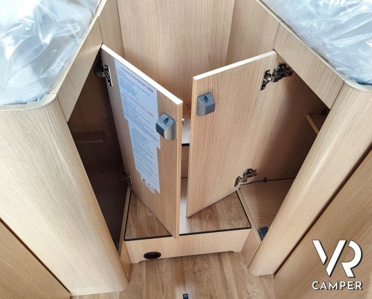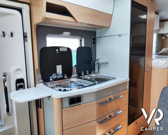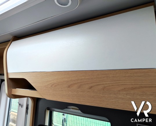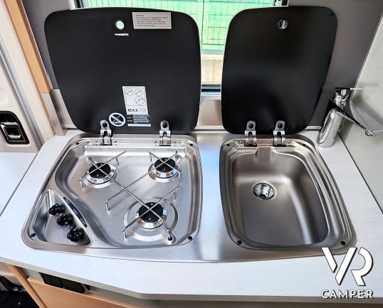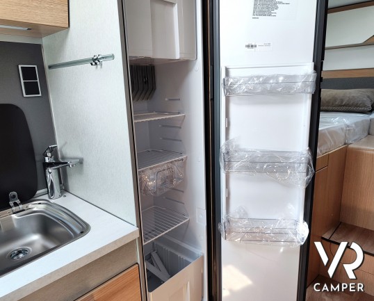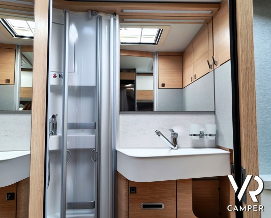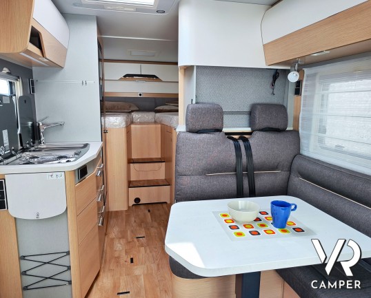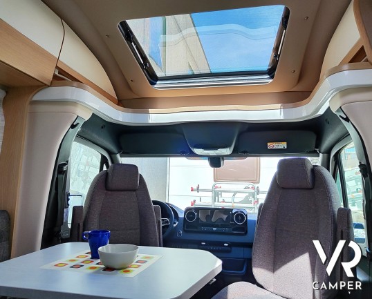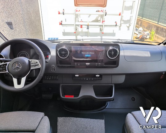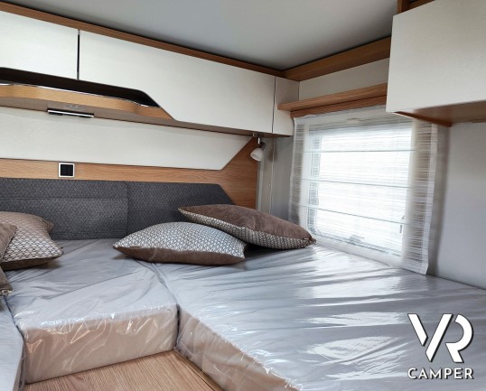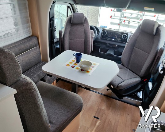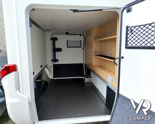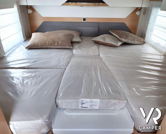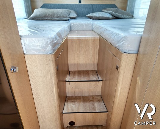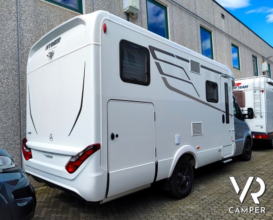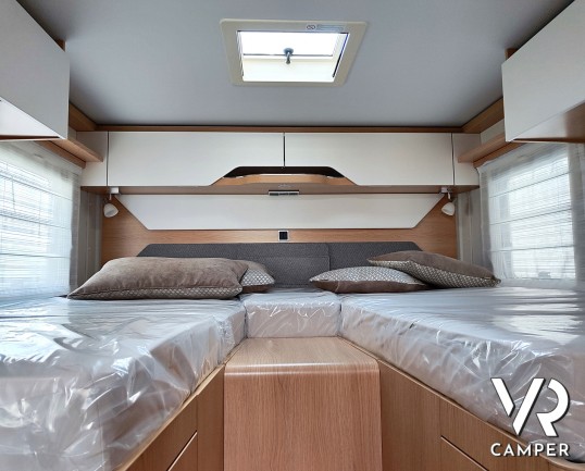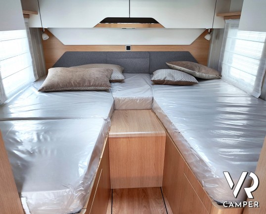 Camper nuovo con letti gemelli e dinette a L trasformabile in letto aggiuntivo. Garage con doppie porte. Su Mercedes-Benz 170 CV, con cambio automatico.