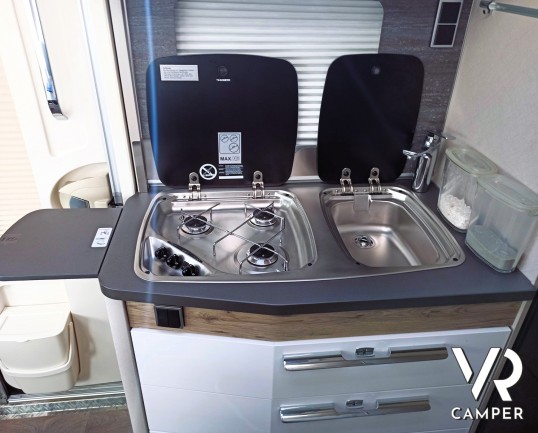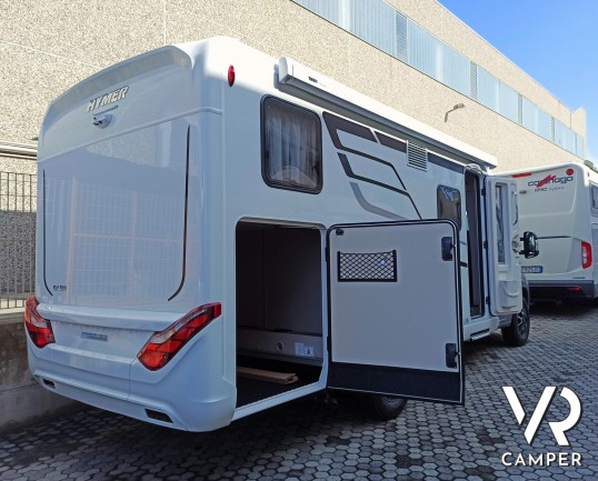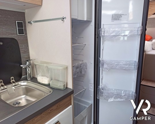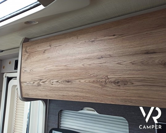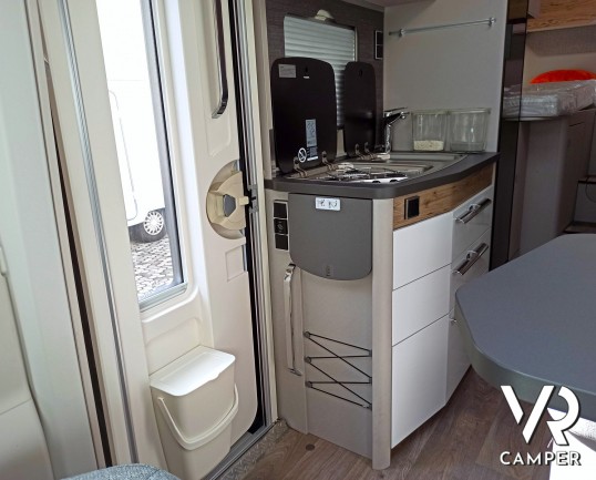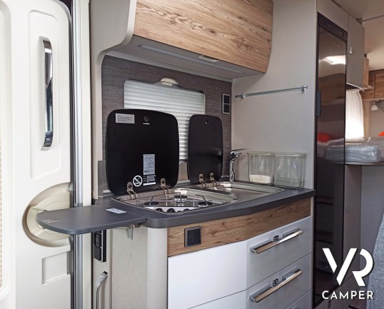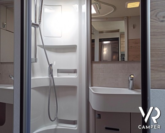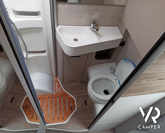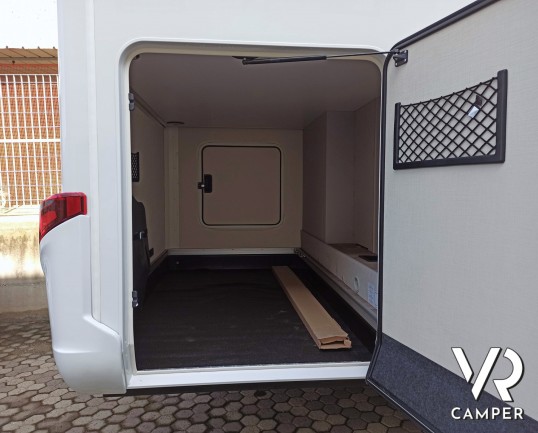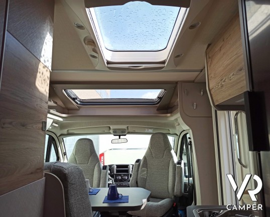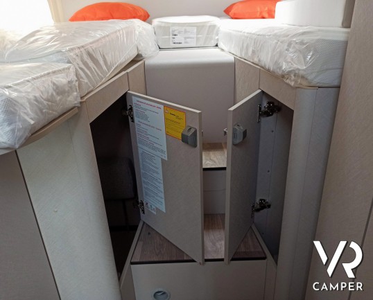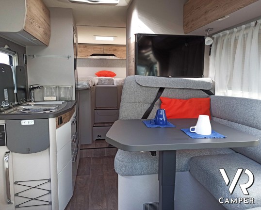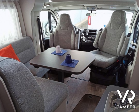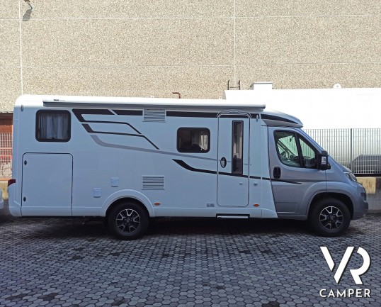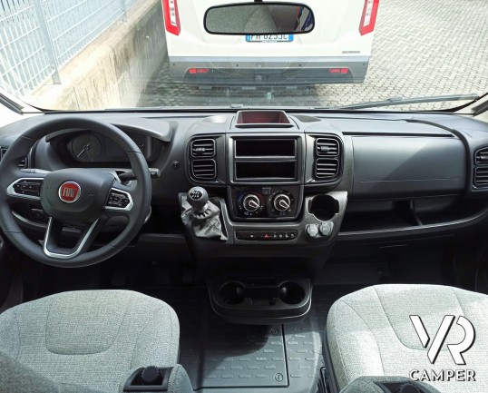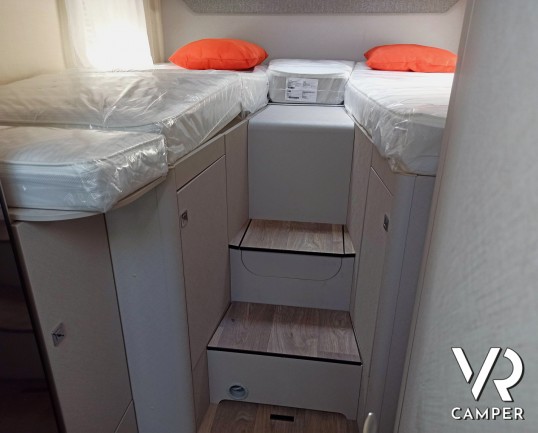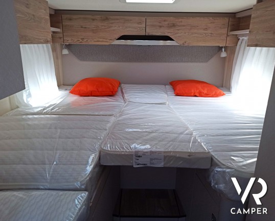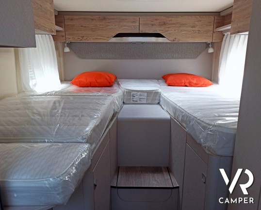 Camper semintegrale nuovo con motore Fiat da 140 CV e telaio Fiat in costruzione leggera. Piantina con letti gemelli trasformabili in matrimoniale XXL.
