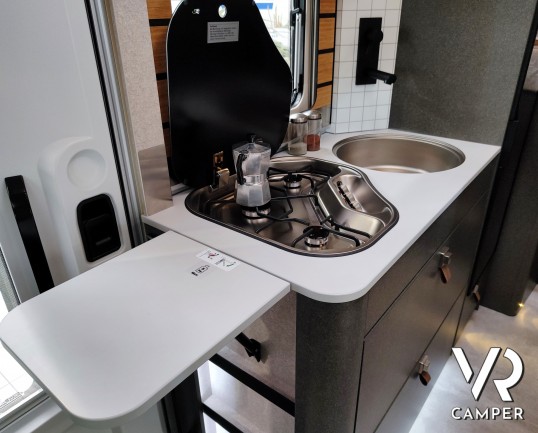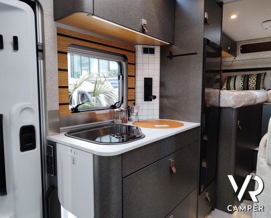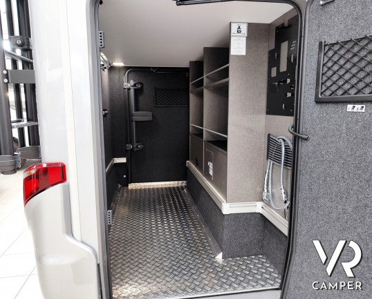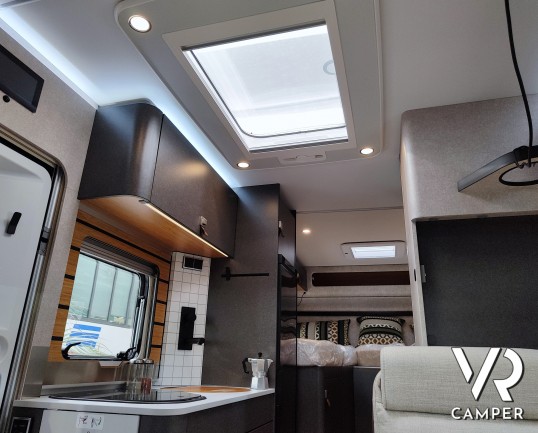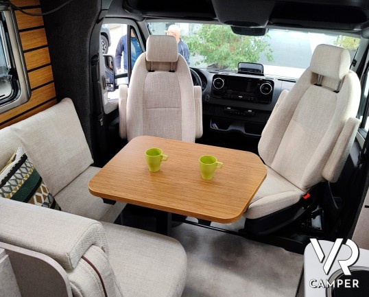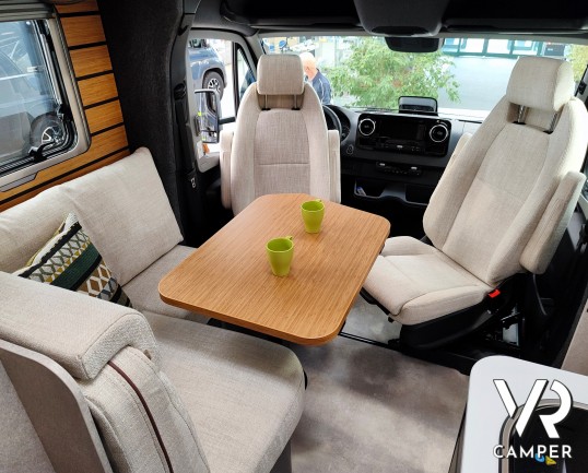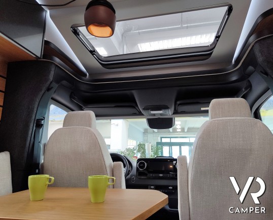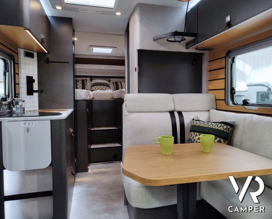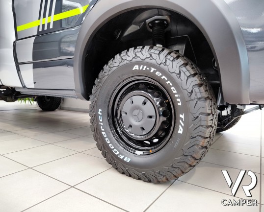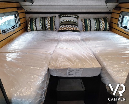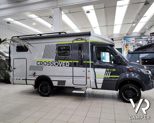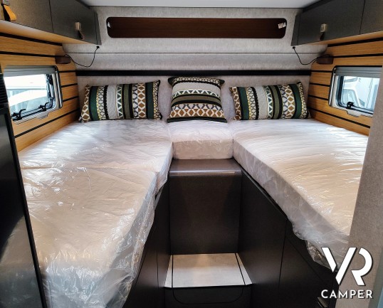 Camper semintegrale con trazione 4x4 su Mercedes-Benz 190 CV. Piantina con letti gemelli, ampia dinette, garage con doppio portellone.Da VR Camper a Torino