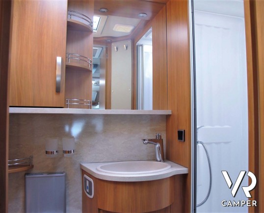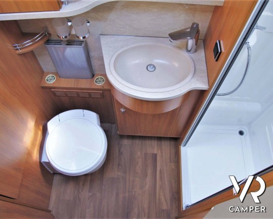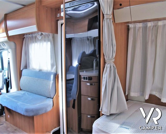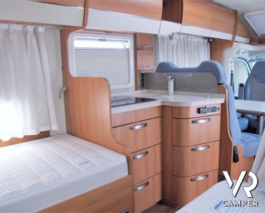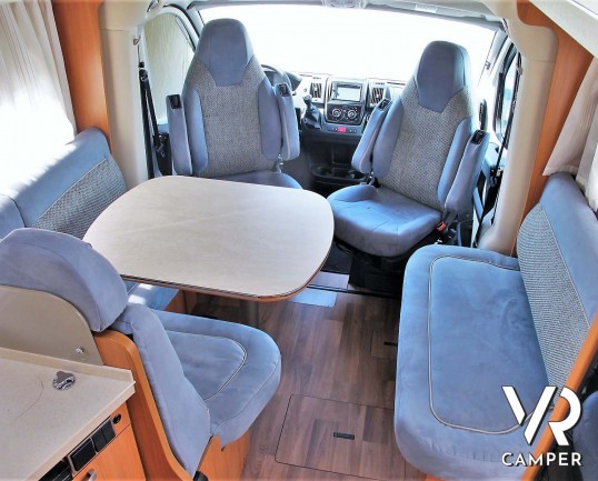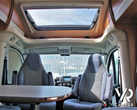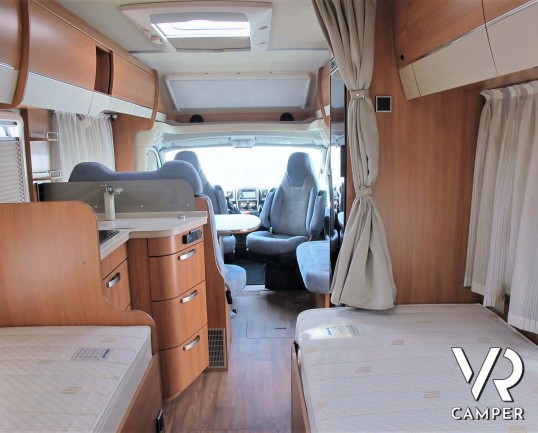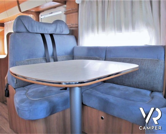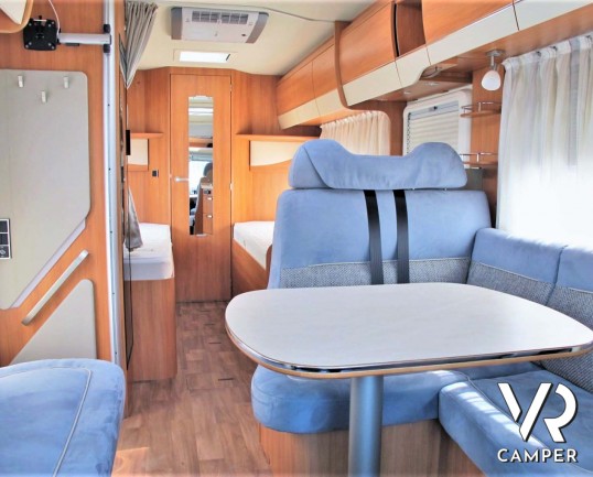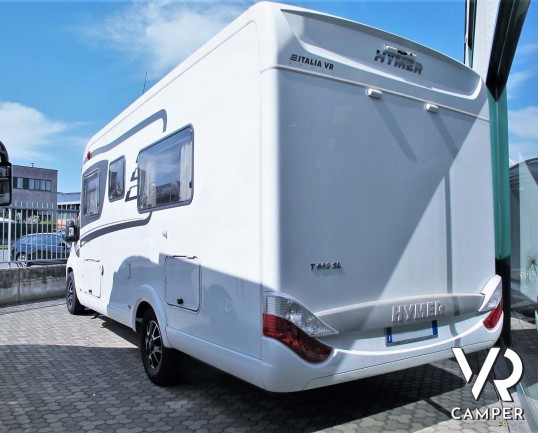 Hymer Tramp 668 SL: camper semintegrale usato con dinette a L, letti gemelli e bagno spazioso in coda. Su Fiat Ducato 150 CV, 4 posti omologati.