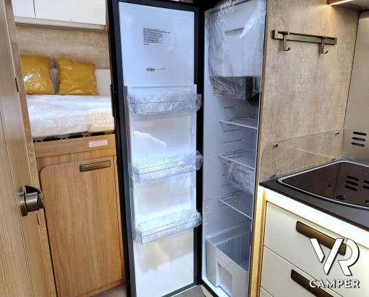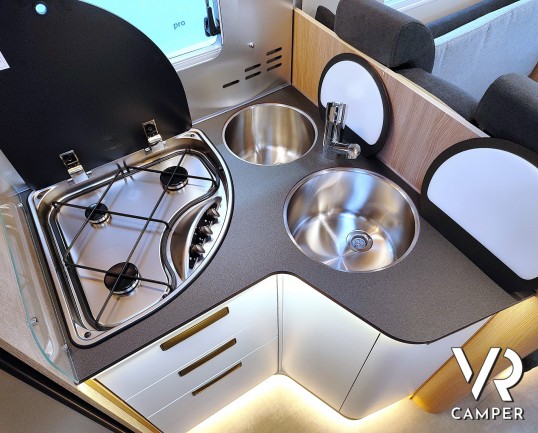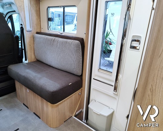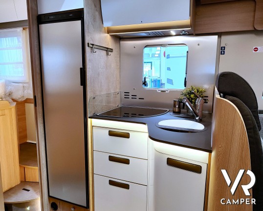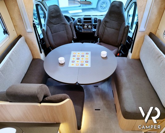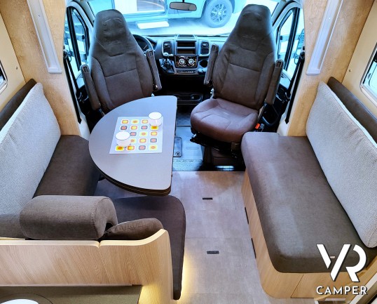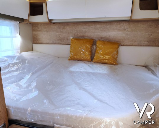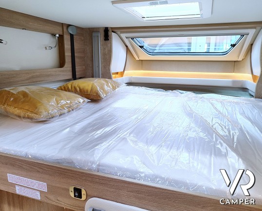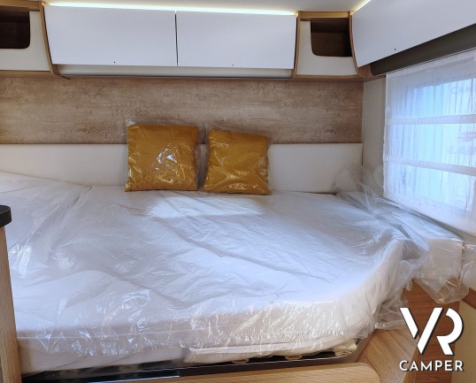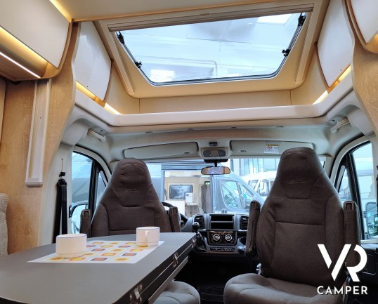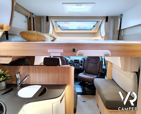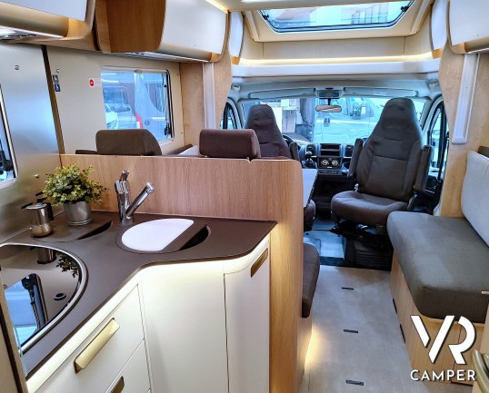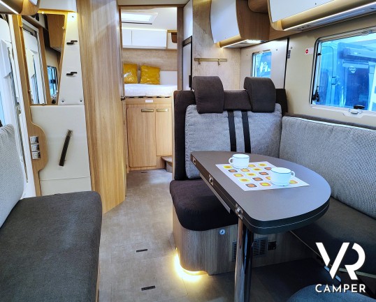 Camper nuovo semintegrale Laika, con letto matrimoniale trasversale posteriore, ampia dinette e cucina a L. Design ricercato e materiali selezionati.