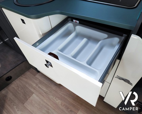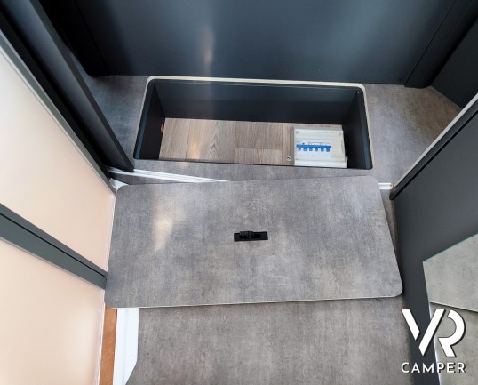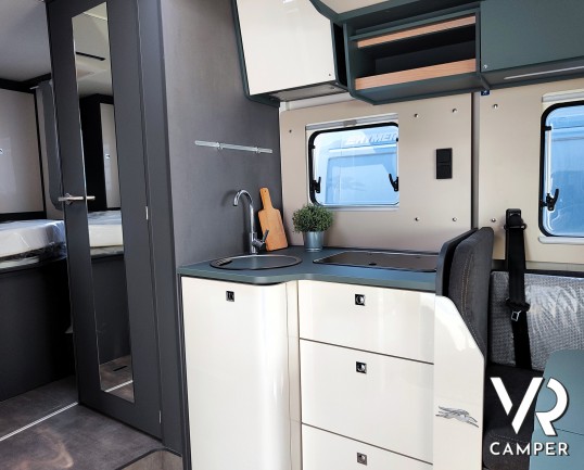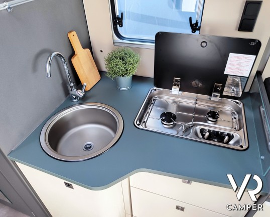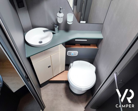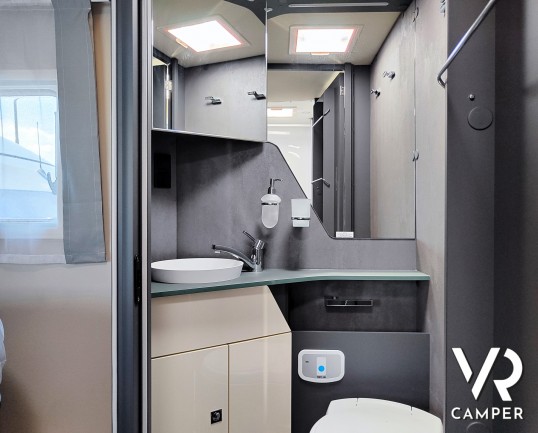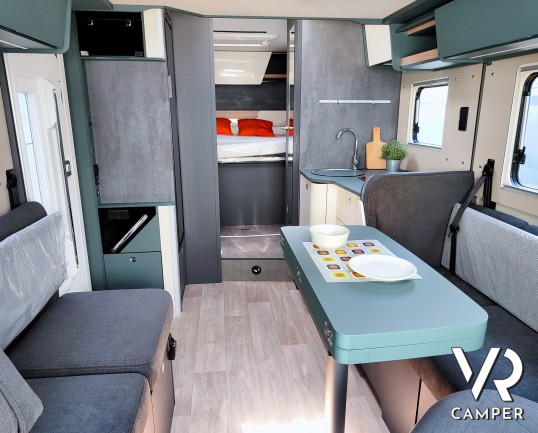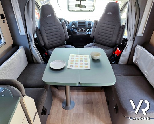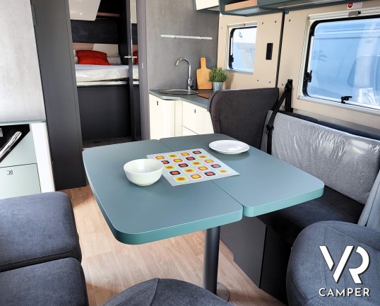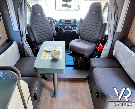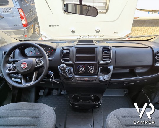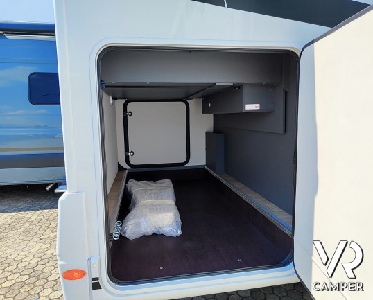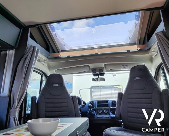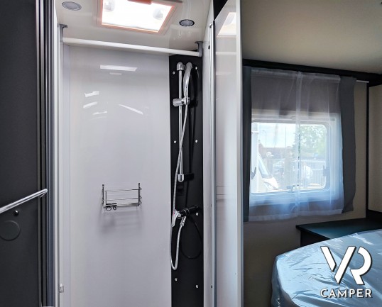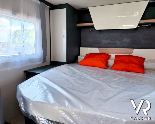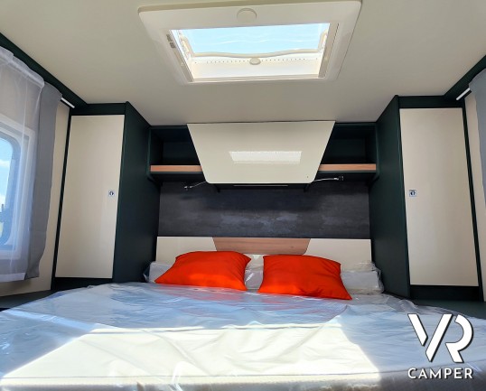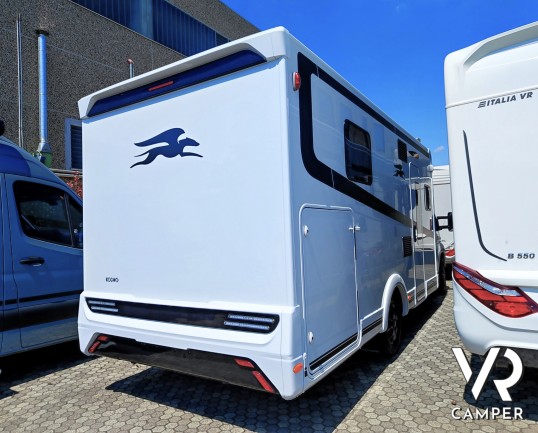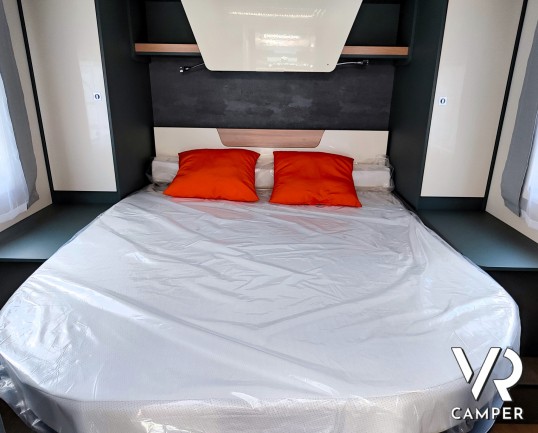 Camper semintegrale con letto matrimoniale e letto basculante per 4 posti letto, bagno con doccia separata e garage. Cupolino monoblocco in vetroresina.