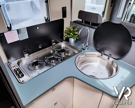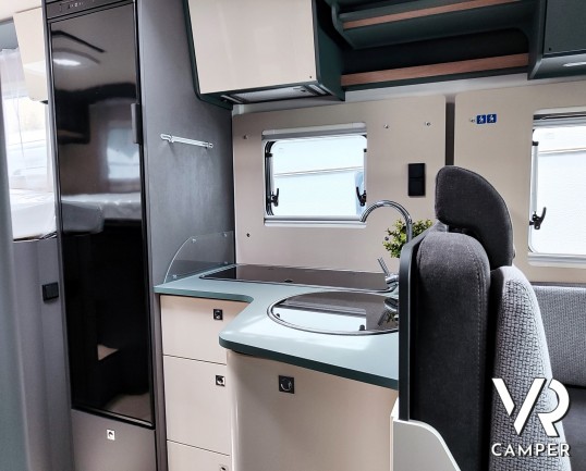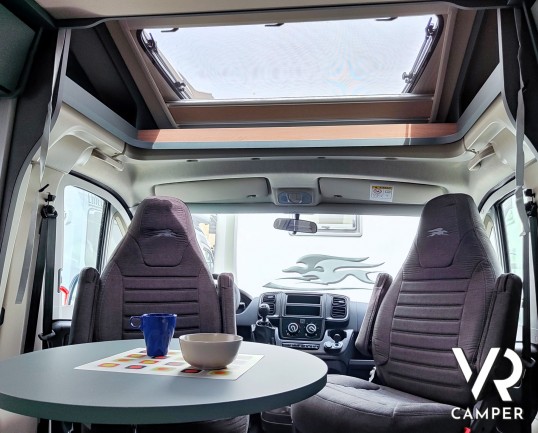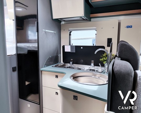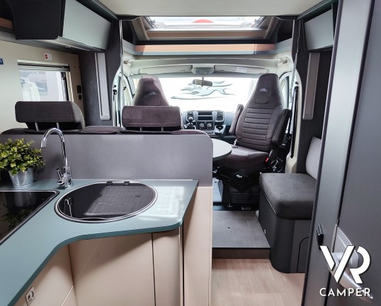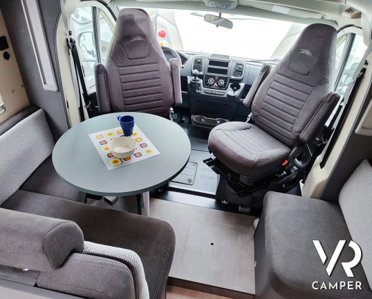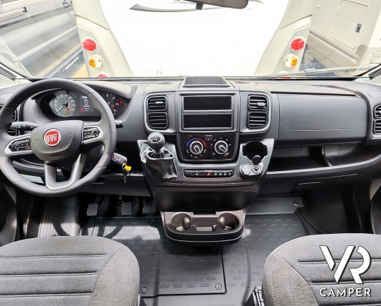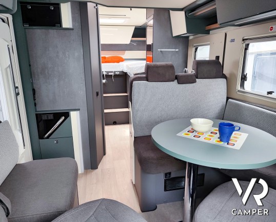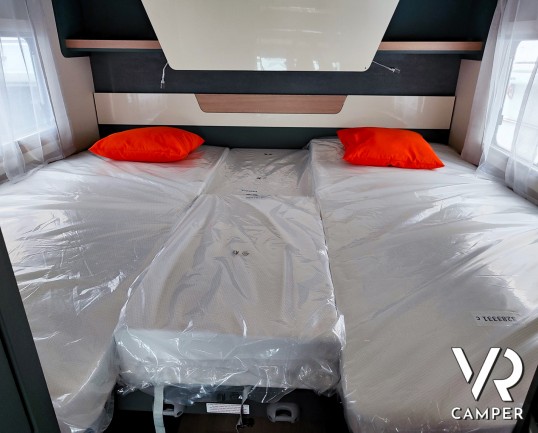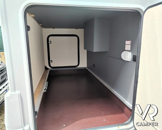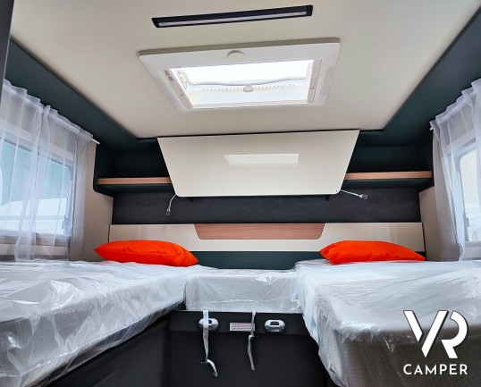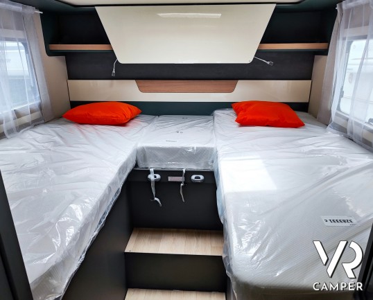 Camper semintegrale nuovo, piantina con letti gemelli, letto basculante, dinette a L con divanetto, bagno con doccia e grande garage. Su Fiat Ducato 140 CV