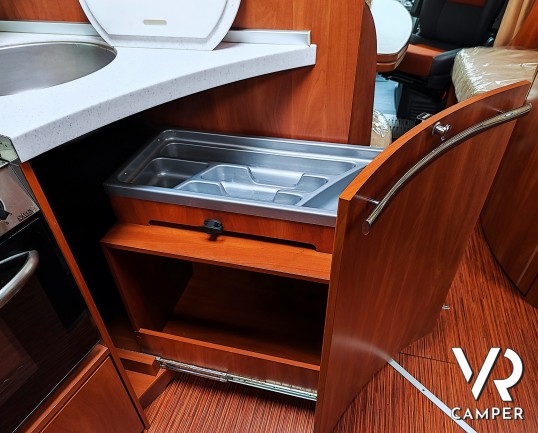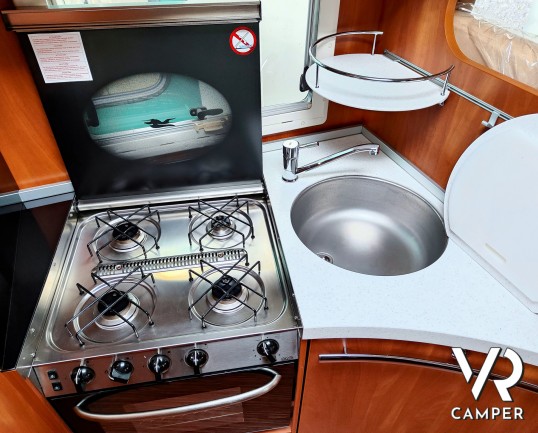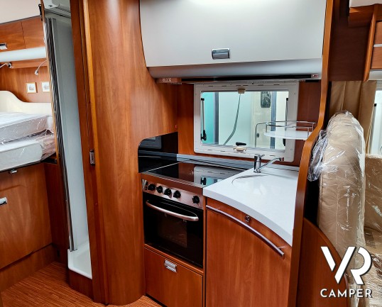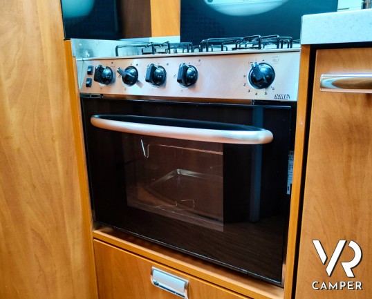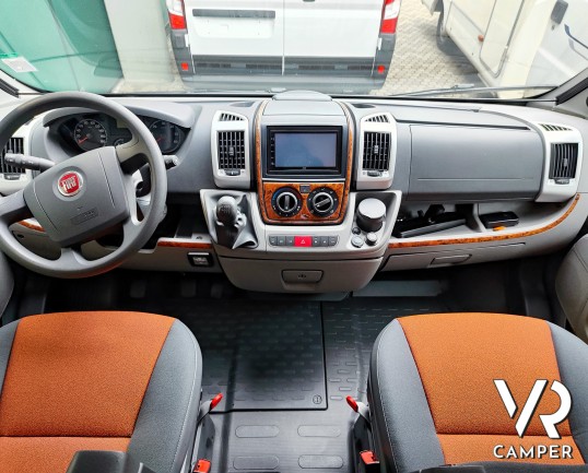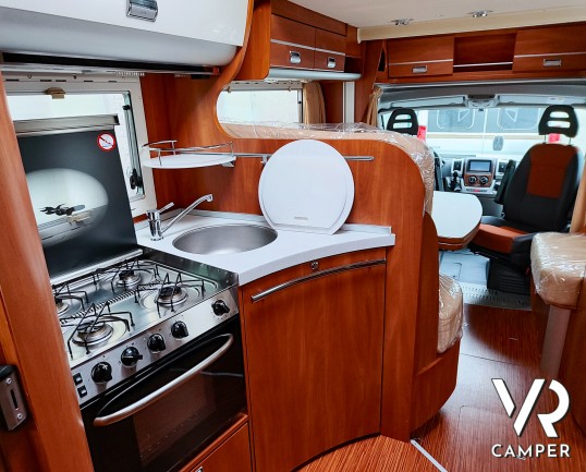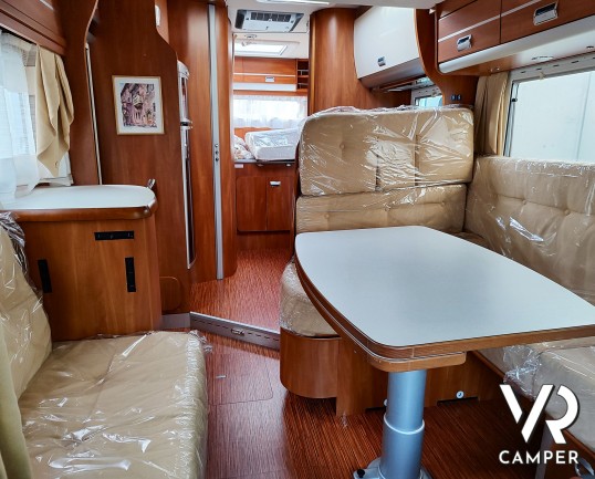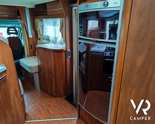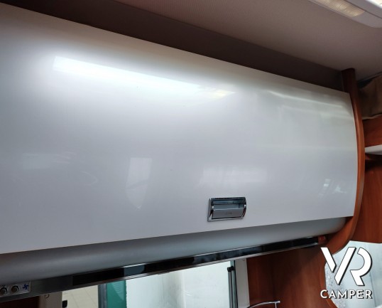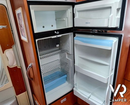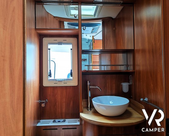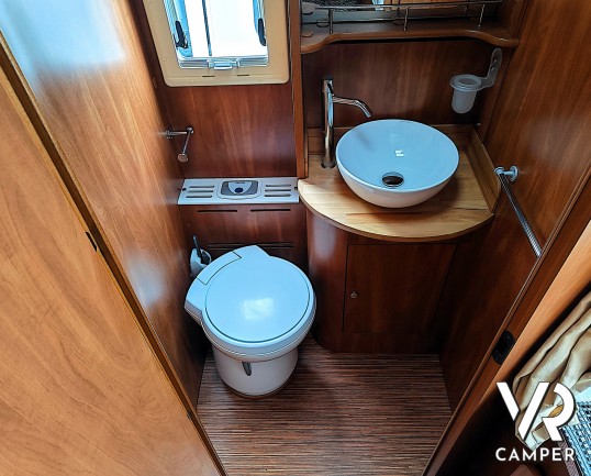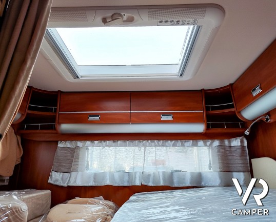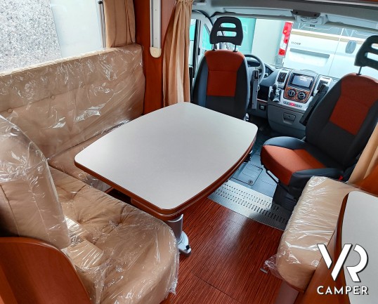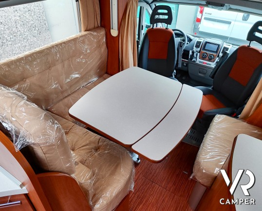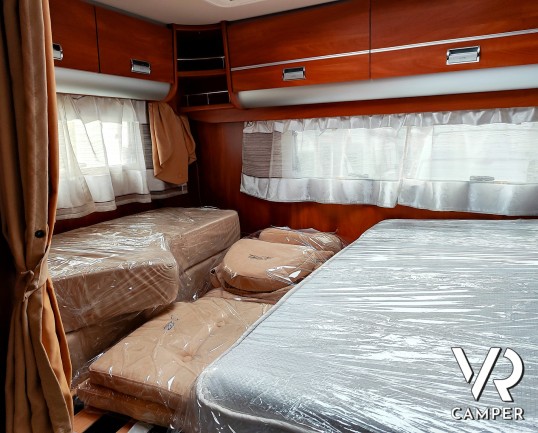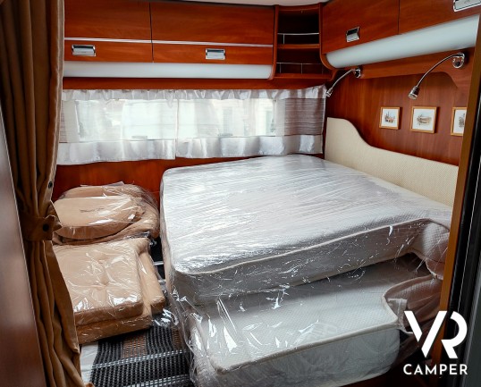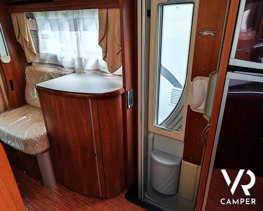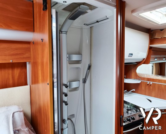 Camper usato con letto matrimoniale posteriore, bagno con doccia separata e garage. 4 posti omologati. Su Fiat Ducato 130 CV. In vendita da VR Camper.