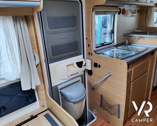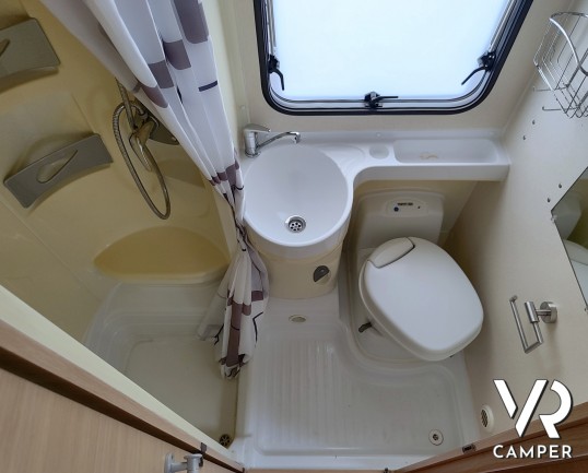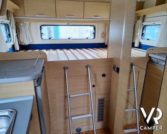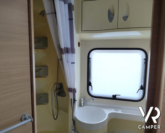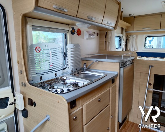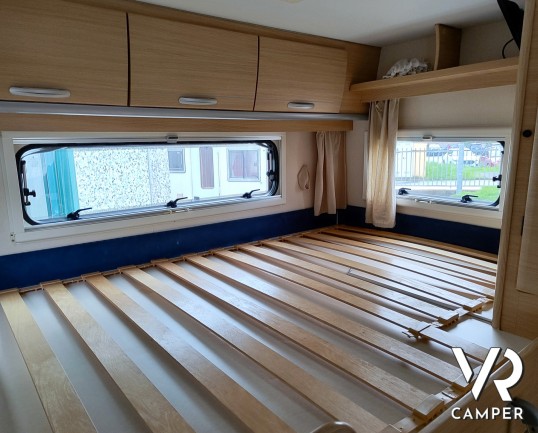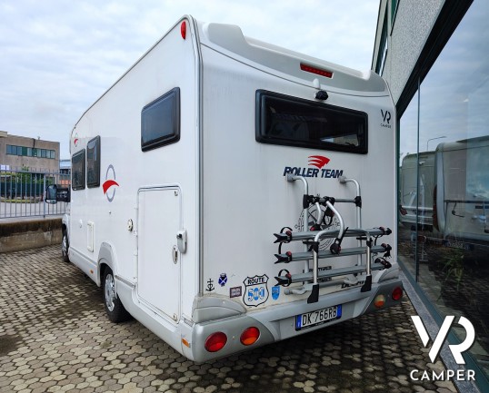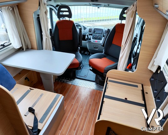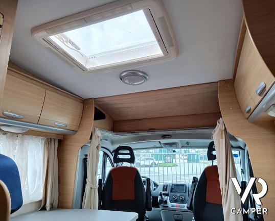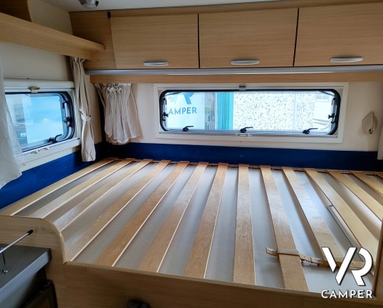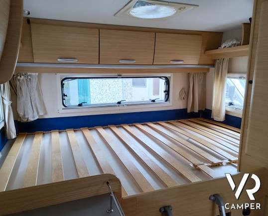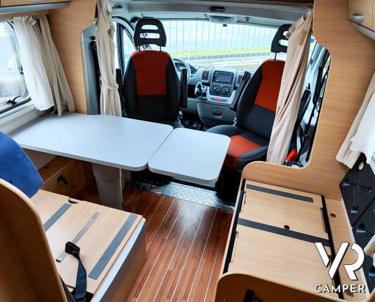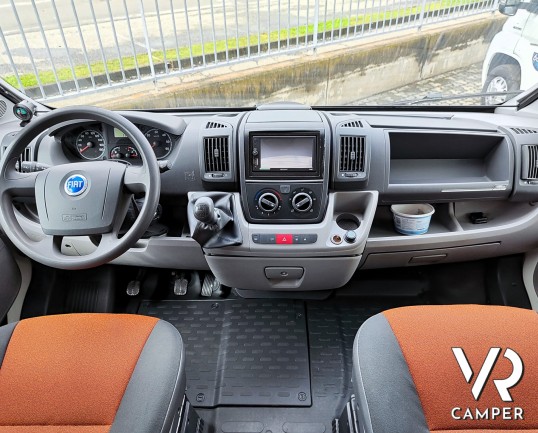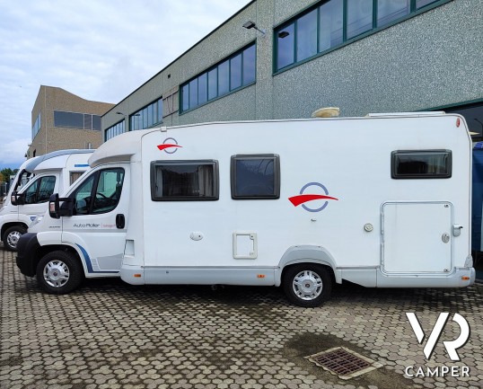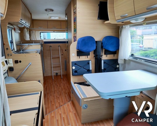 Camper semintegrale usato con 4 posti letto, ampia dinette con due divani, bagno con doccia separata e letto matrimoniale posteriore. Su Fiat Ducato 130 CV